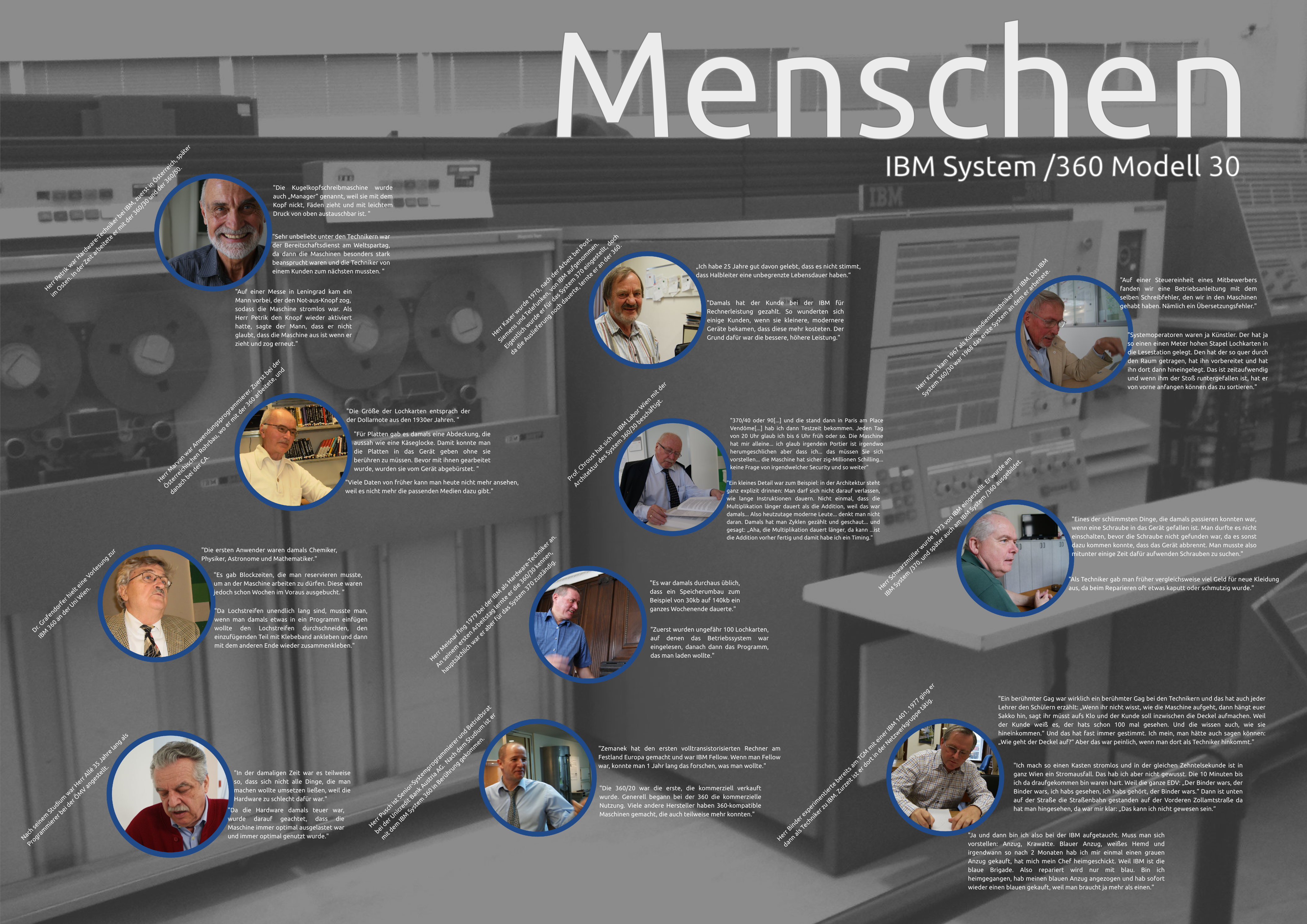 Im Zuge unseres Projektes haben wir Interviews mit Menschen geführt, die damals, als man noch die 360|30 verwendete, mit ihr gearbeitet haben. Darunter waren vor allem IBM-Techniker der damaligen Zeit, aber auch Operators, die mit der Maschine arbeiteten, Systemprogrammierer, die auf der Maschine programmierten und Professoren, die sich wissenschaftlich damit beschäftigten.